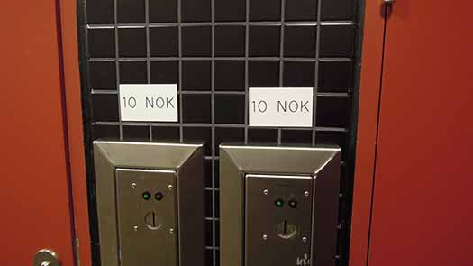 | 物価の高さで驚いたのはビールだけではありません。10NOKと書いてあるのは10ノルウェークローネという意味です。およそ200円。さて何でしょう ? そーです。トイレです。 |