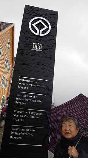 | ブリッゲンといわれて、それが何だかすぐに分かる人はよほどの物知りではないか、と私達不勉強コンビは思ってしまうのです。調べました。ブリッゲンとは、ノルウェー第二の都市ベルゲンの中心部にある、ハンザ同盟時代からの木造の建築物群なのです。最盛期の15世紀にはドイツ北部を中心に200都市を越えたといわれる都市が結んだハンザ都市同盟は、一言でいえばその都市の資源はその都市の商人が独占的に扱い、外来の商人は排他する同盟だったようです。そんな中の一つベルゲンの資源はニシン、サケ、サバなどの水産物、とりわけタラの干物は全ヨーロッパへ大々的に輸出していたようです。そのタラの干物を保管、出荷する為の倉庫、出荷場だった大きな木造の建物が集まった地区、ブリッゲンだったのです。ブリッゲンはノルウェー語で阜頭という意味で、ハンザ同盟時代ドイツ人街だった地区にカラフルで奥行の深い木造倉庫がならんでいます。 |