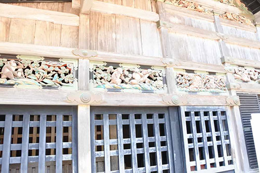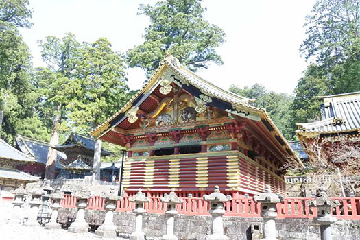 | 名高い三猿が彫られているのがこの厩舎です。実はよく見ると三猿だけでなく猿の一生を描きながら、人の生涯を語っている絵物語になっているのだそうです。 |