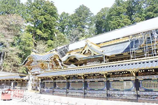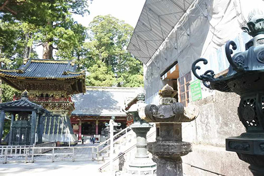 | ところで皆さん東照宮といえば何を思い浮かべますか?陽明門、日暮門ではありませんか?なんとこの日は改修中でカバーがかかって見えなくなっていました。この右手の白いのが陽明門です。 |