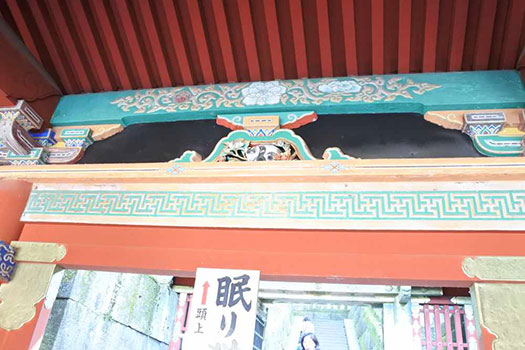 | 眠り猫です。東照宮で最も有名な彫刻です。平穏な世の中の象徴なのだとか。有名なわりに小さくて、見落としてしまいそうです。 |