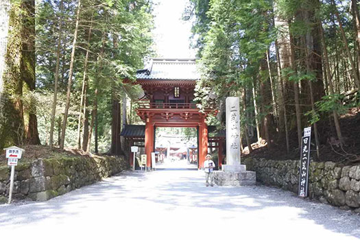 | 見えてきました。日光二荒山神社の楼門です。日光二荒山神社は勝道上人が782年に二荒山登頂に成功し、山頂に祠を祀ったのが奥宮だそうです。 |