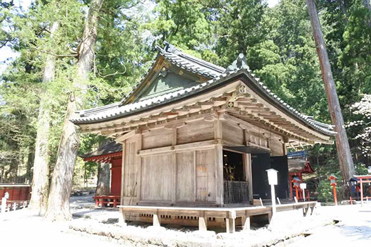 | 神興舎(しんよしゃ)。神苑内にある素木の建物。1617年に東照宮を造営するとき、仮殿の拝殿として建てられたもので、山内に現存する最古の建物だそうです。御神輿が入っています。東照宮の建物がなぜ二荒山神社にあるのか?わかりません。 |