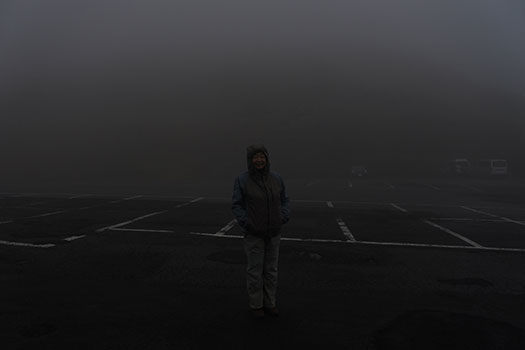 | でもせっかくここまで来たからと車で登ってしまいました。やはり頂上(8合目)は雲の中。ミゾレでした。 |