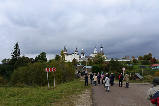 | そしてこれがフェラポントフ修道院の建造物群の遠景です。手前の大勢の人々はたまたま着いた観光客で、普段は人がほとんどいません。 |