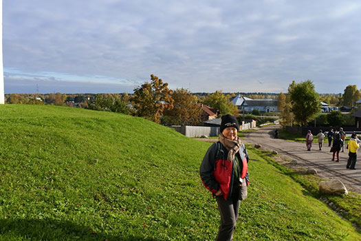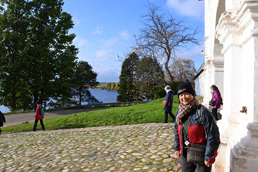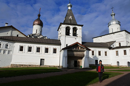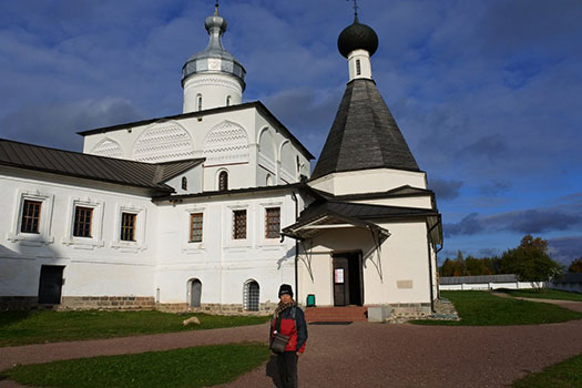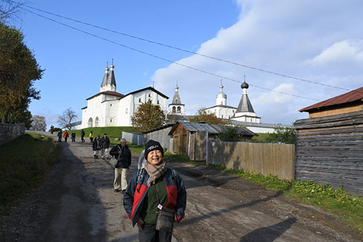 | 正式名称は「フェラポントフ修道院の建造物群」で、2000年に登録されました。この修道院は1398年に聖フェラポントという人によって創建されたそうで、ゴリツィーというサンクト・ペテルブルクからも600km、モスクワからも600kmという場所に建っています。ここの聖堂は1490年代に建設されたロシア北部の建築物の中でも特に保存状態が良く、その内壁は、15世紀から16世紀に活躍したフレスコ画家ディオニシウスによるフレスコ画で描かれていることでも有名です。ロシアの北部、とても寒い場所で、私たちが行った10月3日は晴れていましたが最高気温が7℃、最低気温が3℃でした。冬になると-20℃とか-30℃とかになるそうで、小学校は-20℃で、中学校は-30℃で休校になるそうです。前回のキジー島に比べると時代は新しいせいか、なんとなく見慣れた風情の建物群でした。 |