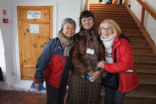 | 中央の半分以上迷惑そうな顔をしているのが現地、修道院のガイドさん、右側の人が全日程付き合ってくれたロシア語/日本語ガイドさん、そして左側、得意気な東洋のオバさんが私です。 |