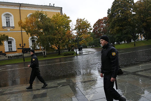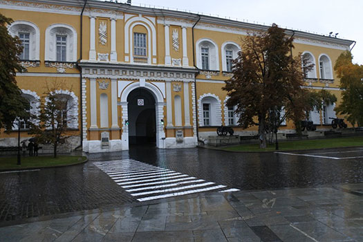 | クレムリンの内は、入口を入って右手に観光客が自由に動きまわれる教会や聖堂、宮殿などのある地区と、左側は大統領府や大統領官邸などの地区とに分かれています。その間の広い車道は見まわりが厳しく、向こう側へは行かれません。 |