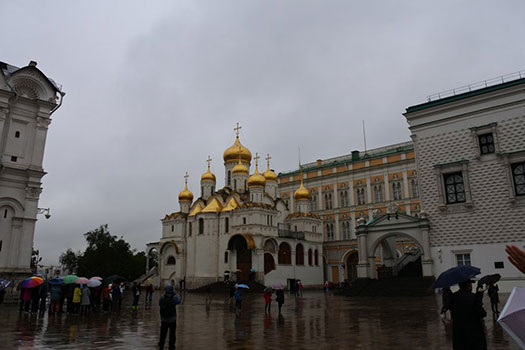 | ウスペンスキー大聖堂です。クレムリンの中心に建つ大聖堂でかつてロシア帝国の国教大聖堂としてロシアで最も権威があった教会とのこと。 |