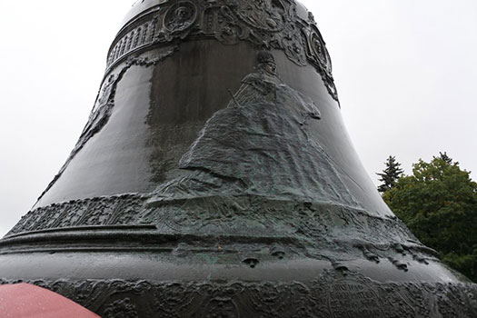 | サテ、この巨大な鋳造物はなんでしょうか?1733年~1735年に造られた鐘の皇帝と呼ばれる重さ200トンもある鐘です。ロマノフ王朝の面々が描かれています。 |