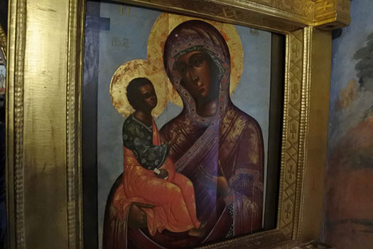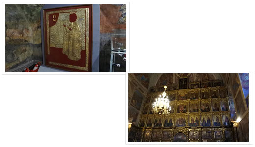 | 入口の壁画も大したもので、17世紀のフレスコ画だそうですが、内部のフレスコ画やイコンは、さすがに素晴らしいものでした。撮影禁止でお見せできないのが残念です。もう飽きたからイイヨなんて言わないで下さいネ。 |