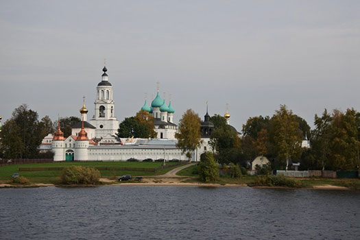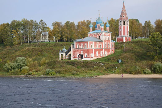 | 今回私たちはサンクトペテルブルクからラドガ湖、オネガ湖、ボルガ河などを通っておよそ1400kmの船旅をしてきました。ところどころで上陸してあちこちを見ながら来たのです。ここはモスクワの手前300㎞ほどのところにあるウグリチ、後ろに見えるのが血の上のドミトリー教会です。 |