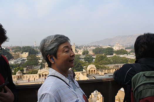 | いちばん高い所まで登るとジャイプルの町が良く見えました。この写真の、私の左目のあたりに写っている三角の建物が、今日の主役、ジャンタル・マンタルの観測儀の一つサムラート・ヤントラと言う計測器です。 |