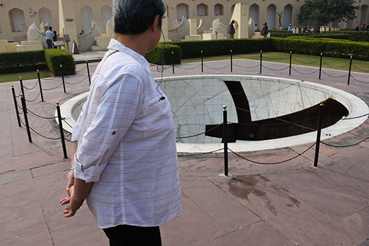 | ジャンタル・マンタルと言うのは天文台と言うか、巨大な天文観測儀と言った物です。前回のアンベール城の近く、ジャイプルに有り、サワーイ・シャイ・スイン2世と言う王様が造ったもので、300年近くたった現在でも現役で使われているのだそうです。インドの文化遺産と言うとほとんどがムガル帝国に関係の有る物が多いですが、これはアルベール城と同じく、現地の豪族によるものでムガル帝国とは直接関係のない建造物です。 |