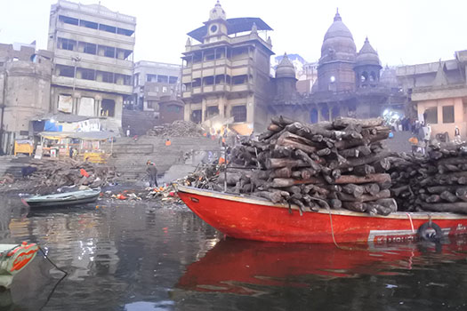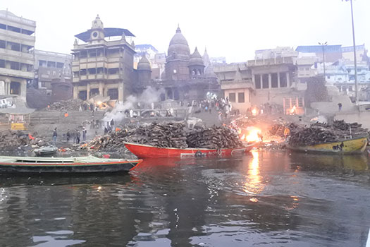 | インドの人口の80%はヒンドゥ教徒だそうです。そのヒンドゥ教徒の火葬場です。船はガンジス河に浮んでいます。 |