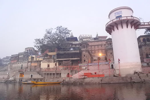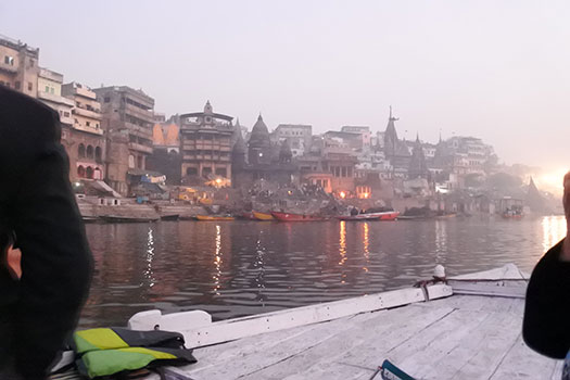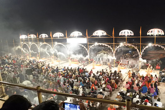 | 大勢の人々が集まっているのは、ガンジス河に向かってお祈りしているところです。別に何のお祭りとかでなく、毎晩やっているのだそうです。 |