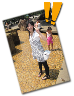 | とっても広い飛鳥山公園ですが、今日はここまで。 飛鳥山を出る前に記念写真。 噴水をバックにさわやかな笑顔の2人ですが、 この岩、鉄板のように熱いという噂です。 |