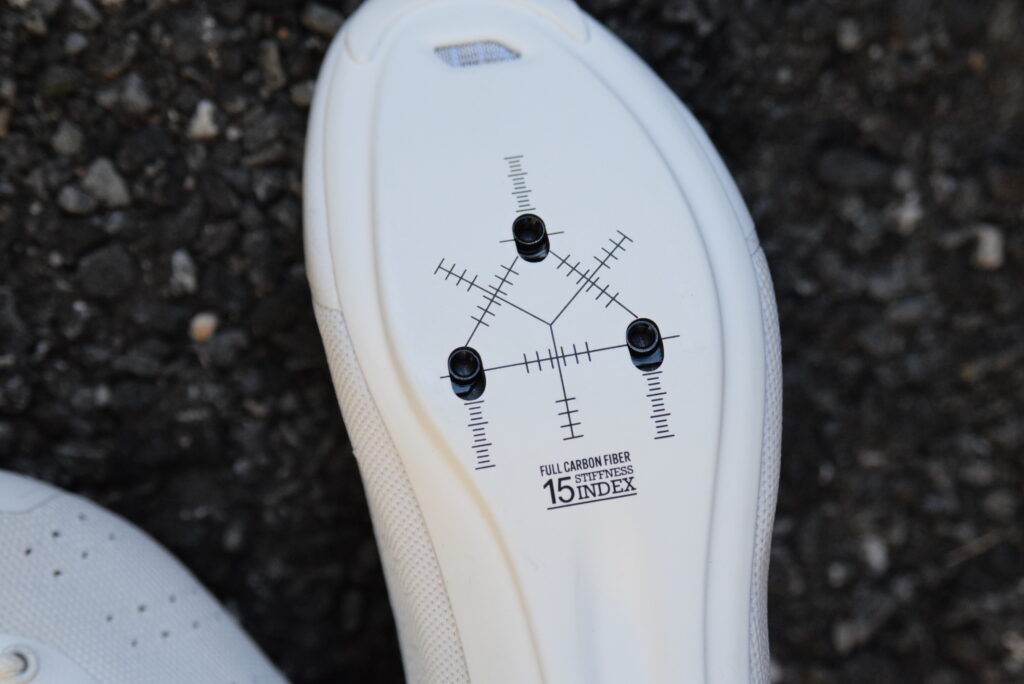 変更点はカラーリングだけでなく、剛性をさらに高めた「R600」アウトソールにグレードアップ。剛性指数は14から15になりました。クリート取り付け穴も前後に4mm動くようになりました。