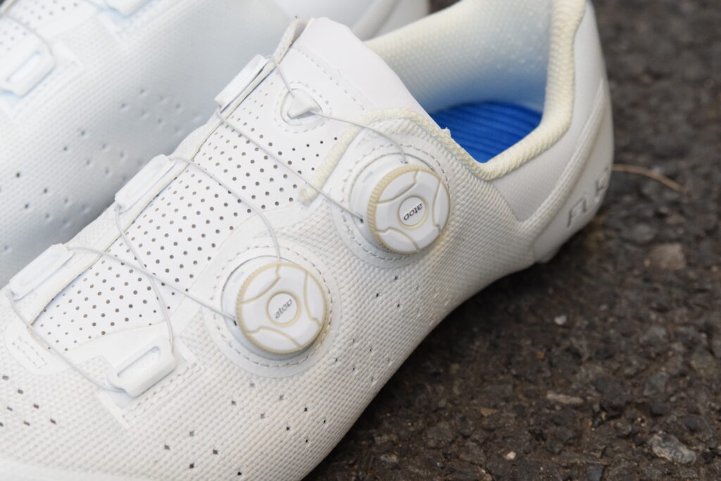 FLR FNT-9は、ニットアッパーが足形にしなやかに寄り添い、幅広・甲高といった日本人に多い足型でもストレスのないフィット感を実現。それでいて、ワールドツアーレーサーも使用するフルカーボンソール「R600」により、踏んだ力は一切逃さず確実に推進力へ変換されます。