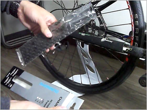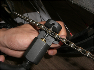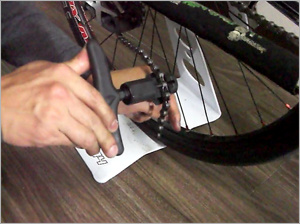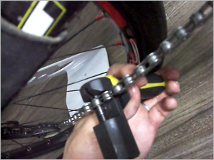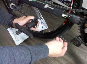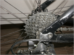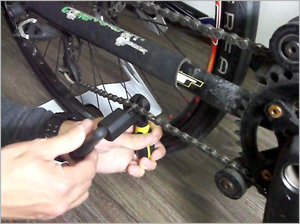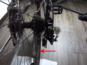 この時、リアディレーラー(後ろ変速機)は一番大きいギア側に来るようにレバーで調節しておきます。 | |