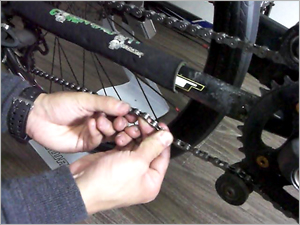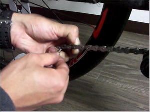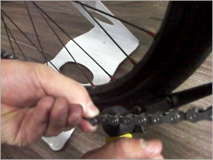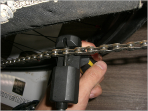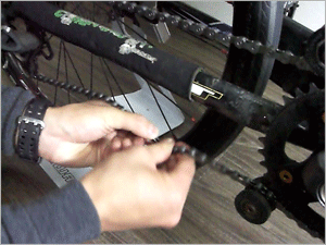 ピンを押し込んでいきます。 "ピンには段差があり段差がかちっとはまるところまで入れます。差し込みすぎてしまうとチェーンの動きが渋くなったり 最悪チェーンが外れてしまう可能性があるので注意しましょう。 |