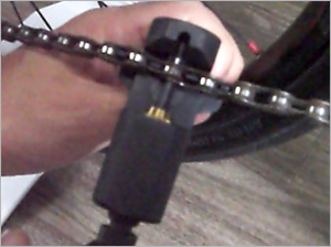チェーンカッターの軸の部分をピンにあてピンのガイド部分をチェーンに差し込んでセットします。 | |
