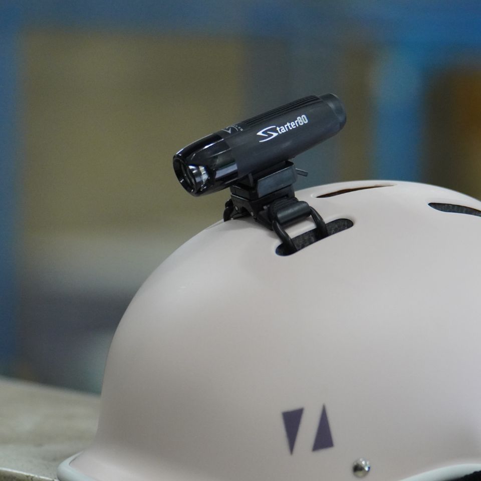 ヘルメットに取り付けのできるゴムバンド式。高い位置に取り付ければ、視認性がグッとアップして安全性が上がります。