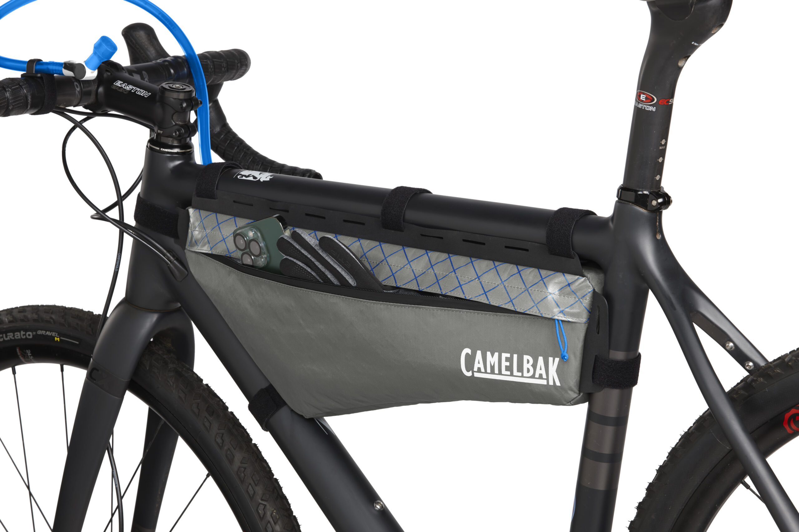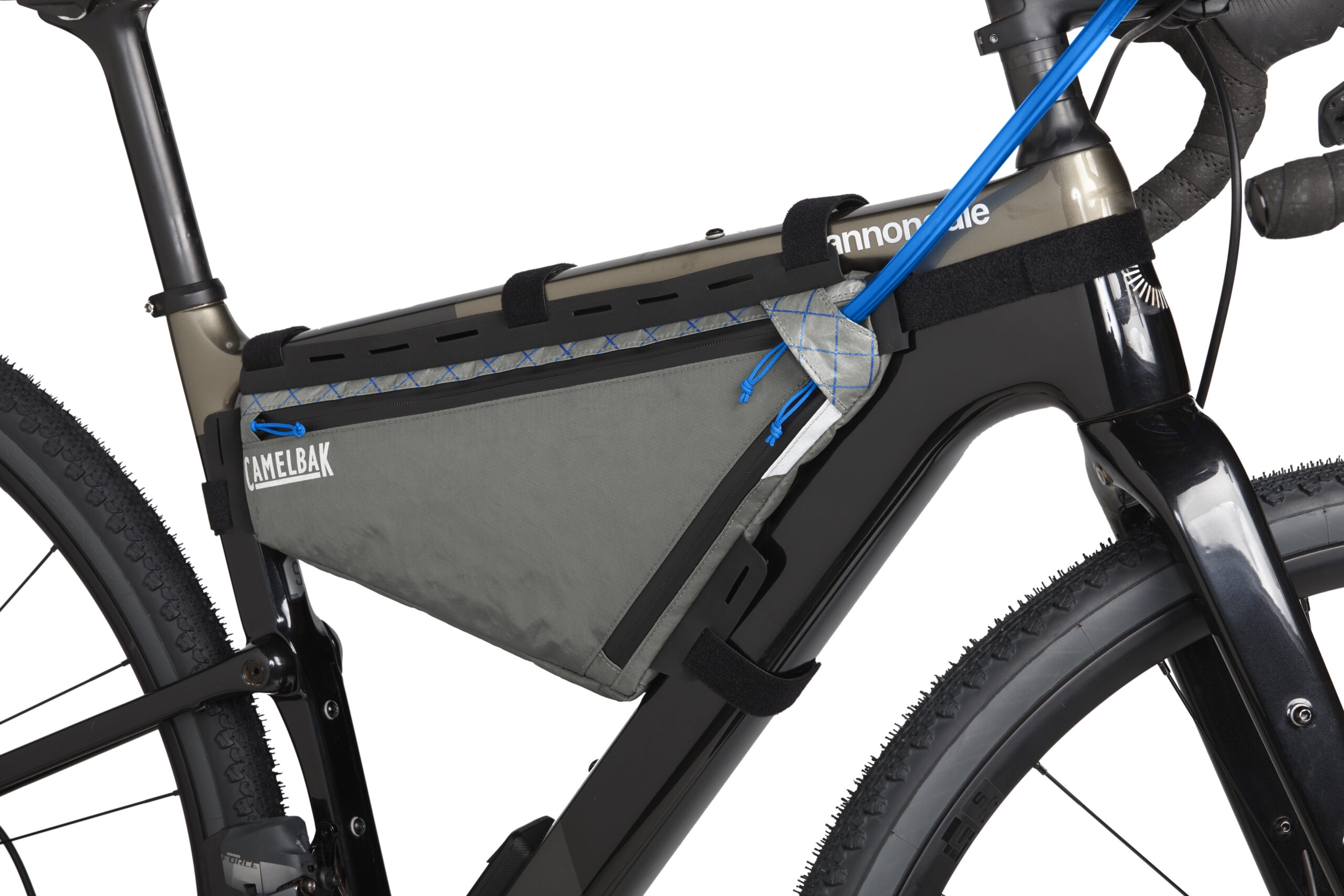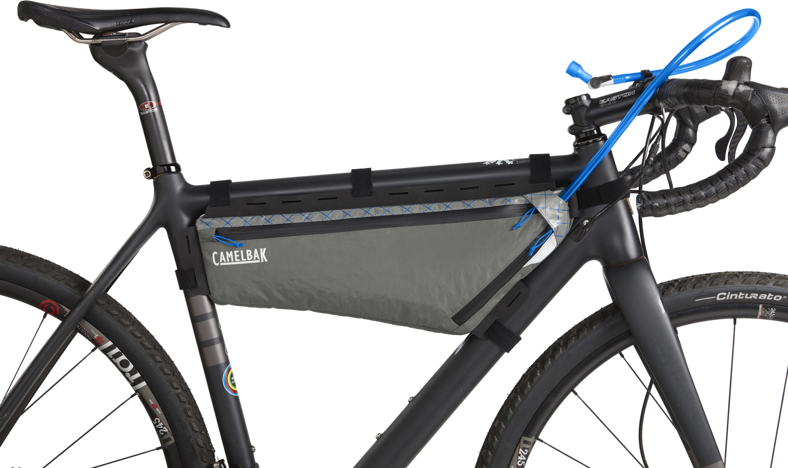 リザーバーを背負わなくてよい時代がやってきました。フレームバッグ内部に新開発のフレームバッグリザーバーを格納し、ライダーの身体的負担を軽減します。リザーバーのチューブホースは付属のアタッチメントでハンドルに固定することができます。視線を前方から逸らすこともなく、ほとんど姿勢変化もせずに飲水ができるので、ボトルよりも安全で確実な水分補給を実現します。またリザーバーを格納した状態でも、補給食やツールなどライドに必要なものを収納するすることが可能です。