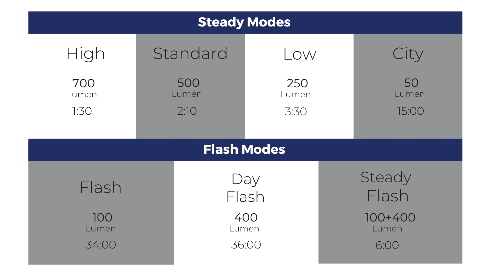 点灯モード / 点灯時間 / ルーメン:Steady 4モード / Flash 3モード / 最大36h / 最大700lm