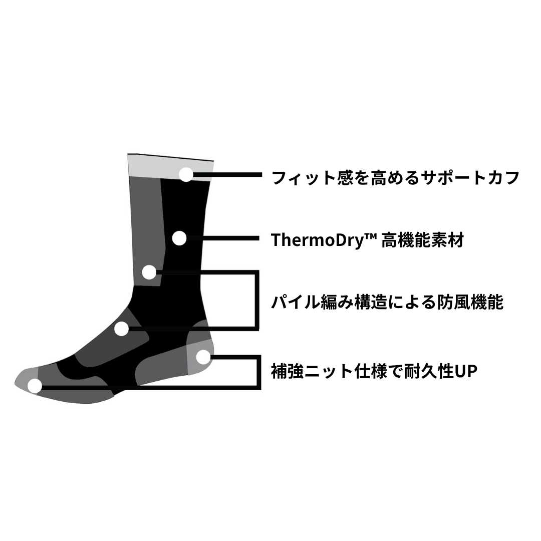 ●高い保温性と通気性を持つThermoDry™高機能素材(保温吸湿性に優れた化学繊維)を使用