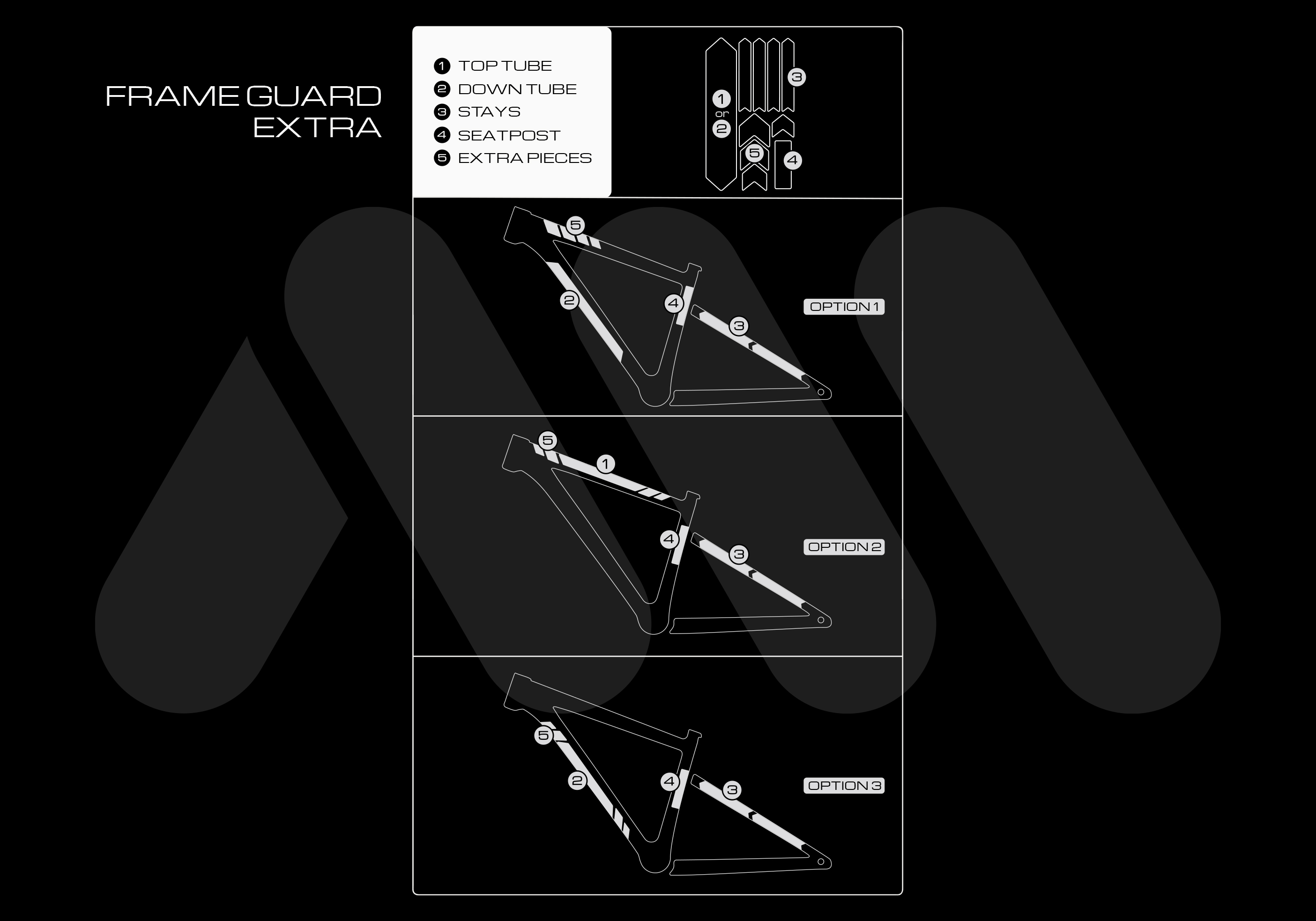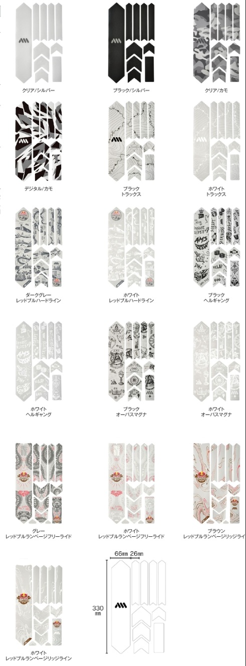 適合 : トレイル / オールマウンテン / DH 等全方位フレーム向け保護(ダウンチューブ ×1 / 多用途アロー形状 ×4 / ステー用 ×4 / ケーブル用 ×1)