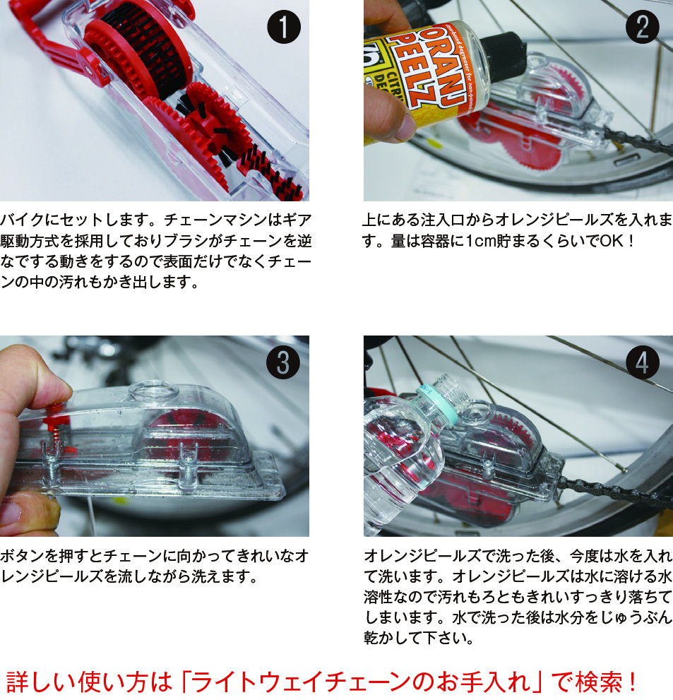 ●簡単にチェーンをピカピカにできるクリーナー。ギヤ駆動によって104 本のブラシが強制的に洗浄。●チェーンと逆回転するブラシが中の汚れをかき出す。●洗浄剤をチェーンの上から流す特殊構造。