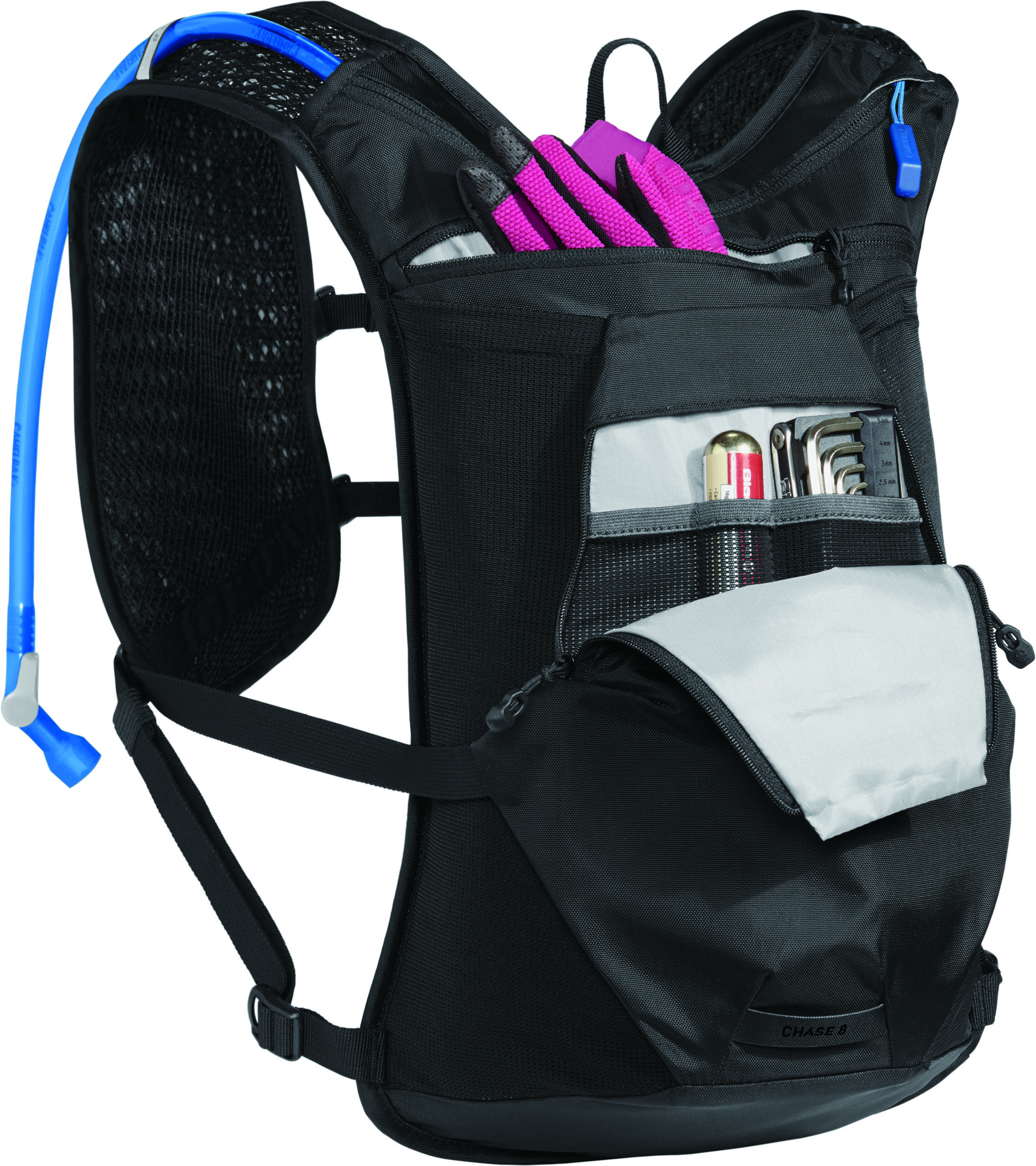 ●ショルダーハーネスには大型のジッパーポケットとストレッチポケットを装備。