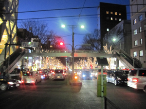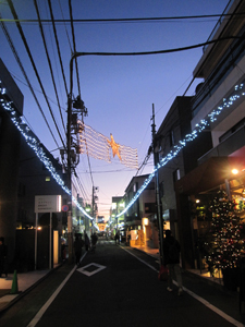 さあ、 もうこんなに暗くなりました。 商店街や裏道も 控えめですが こんなに綺麗に ライトアップしています。 |