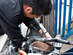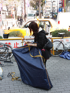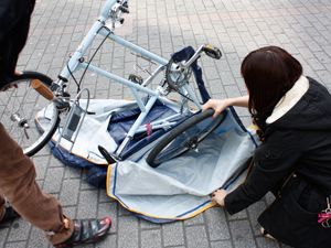 まずは池袋駅前の広場で 自転車をバラします。 輪行初挑戦のアズは ゆみたの指導を受けながら 解体。 ※邪魔にならない 広いところで行いましょう。 |