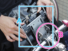 つけ方は…別売りのA.ハンドルバーホルダーEC、B.フロントキャリアラックを取りつけます。 そのラックにカチッとはめるだけ。鍵をしめれば盗難防止に。 |