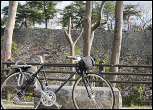 城巡りにはかならず付きまとう登坂問題もコンパクトギアでしっかり対応。 今回も伊賀の峠越えをコンプリートさせてくれました。意外と良かったのは650Cの小さめホイール。 ふつうに走れるし、何より全体的にコンパクトに軽くなるので輪行がグンと楽になります。サイズは小さくなり、本来は155cm前後の人のためですが、160cm台の人までなら乗れますよ。ただし、スピードも出しやすいフレーム設計になっているのでデフォルトだとかなり前傾姿勢になり、乗りまわすには慣れが必要です。 もしくはステムの交換を検討して角度の大きいステムを入手しましょう。 |